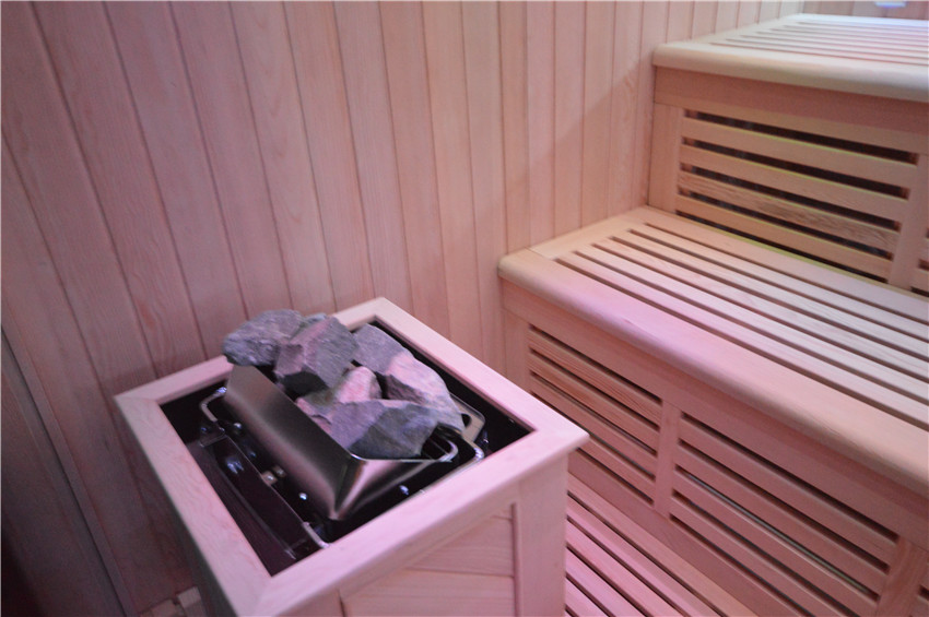 - Saunasteinen, Edelstahleimer, Kelle, Sanduhr, Thermometer und Hygrometer.