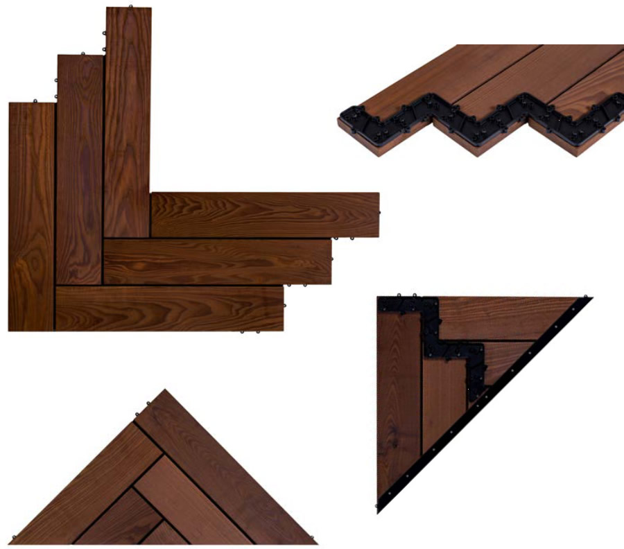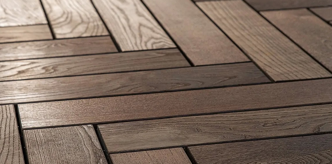 Thermo Esche Herringbone Terrassensystem Fischgräte 28x812x500mm und Start Endcap 28x812x394mm